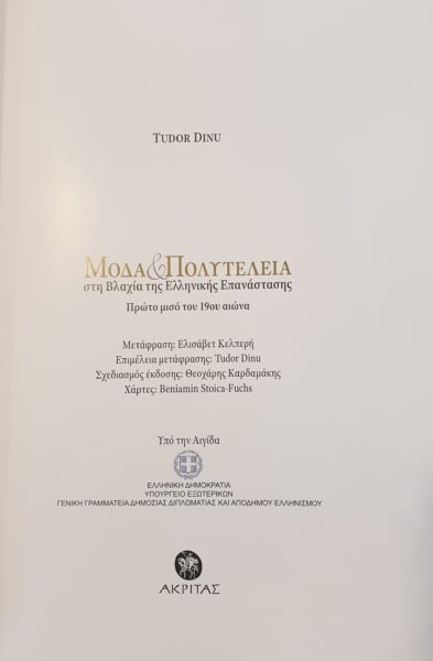 Η Γενική Γραμματεία Διπλωματίας και Απόδημου Ελληνισμού ξέδωσε υπό την αιγίδα της πολυτελή επετειακό τόμο. Ο Γενικός Γραμματέας κ. Γιάννης Χρυσουλάκης τόνισε: “Χορηγήσαμε αιγίδα σε μία πολύ σημαντική έρευνα και έκδοση: Mόδα και Πολυτέλεια στη Βλαχία της Ελληνικής Επανάστασης».