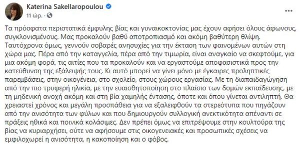 «Τα πρόσφατα περιστατικά έμφυλης βίας και γυναικοκτονίας μας έχουν αφήσει όλους άφωνους, συγκλονισμένους. Μας προκαλούν βαθύ αποτροπιασμό και ακόμη βαθύτερη θλίψη. Ταυτόχρονα όμως, γεννούν σοβαρές ανησυχίες για την έκταση των φαινομένων αυτών στη χώρα μας. Πέρα από την καταγγελία, πέρα από την τιμωρία, είναι αναγκαίο να σκεφτούμε, για μια ακόμη φορά, τις αιτίες που τα προκαλούν και να εργαστούμε αποφασιστικά προς την κατεύθυνση της εξάλειψής τους. Κι αυτό μπορεί να γίνει μόνο με έγκαιρες προληπτικές παρεμβάσεις, στην οικογένεια, στο σχολείο, στους χώρους εργασίας. Με τη διαπαιδαγώγηση από την πιο τρυφερή ηλικία, με την ευαισθητοποίηση στο πλαίσιο των δομών εκπαίδευσης, με τη μηδενική ανοχή ακόμη και στη βία χαμηλής έντασης, όποτε και όπου γίνεται αντιληπτή. Θα χρειαστεί χρόνος και μεγάλη προσπάθεια για να εξαλειφθούν τα στερεότυπα που πηγάζουν από την ανισότητα των φύλων και που δημιουργούν συλλογική ανεκτικότητα απέναντι σε πράξεις ηθικά και ποινικά κολάσιμες. Δεν πρέπει όμως να επιτρέψουμε στην κουλτούρα της βίας να κυριαρχήσει, ούτε να αφήσουμε στις οικογενειακές και προσωπικές σχέσεις να εμφιλοχωρεί η ανισότητα, η κακοποίηση και ο φόβος».