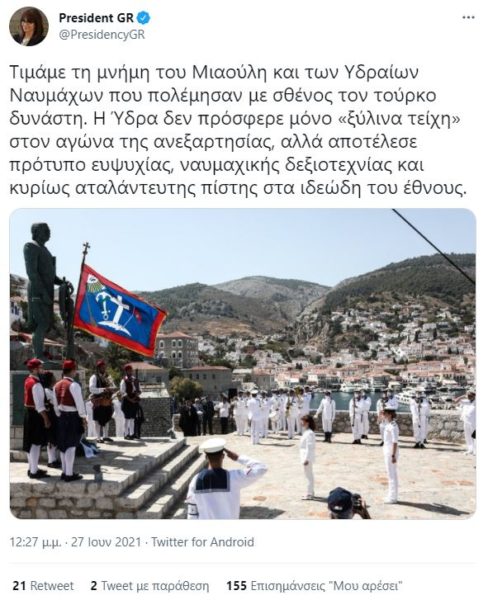 Η Πρόεδρος της Δημοκρατίας κα. Κατερίνα Σακελλαροπούλου με επίκαιρη ανάρτησή της στα μέσα Κοινωνικής Δικτύωσης έγραψε «Τιμάμε τη μνήμη του Μιαούλη και των Υδραίων Ναυμάχων που πολέμησαν με σθένος τον τούρκο δυνάστη. Η Ύδρα δεν πρόσφερε μόνο «ξύλινα τείχη» στον αγώνα της ανεξαρτησίας, αλλά αποτέλεσε πρότυπο ευψυχίας, ναυμαχικής δεξιοτεχνίας και κυρίως αταλάντευτης πίστης στα ιδεώδη του έθνους».
