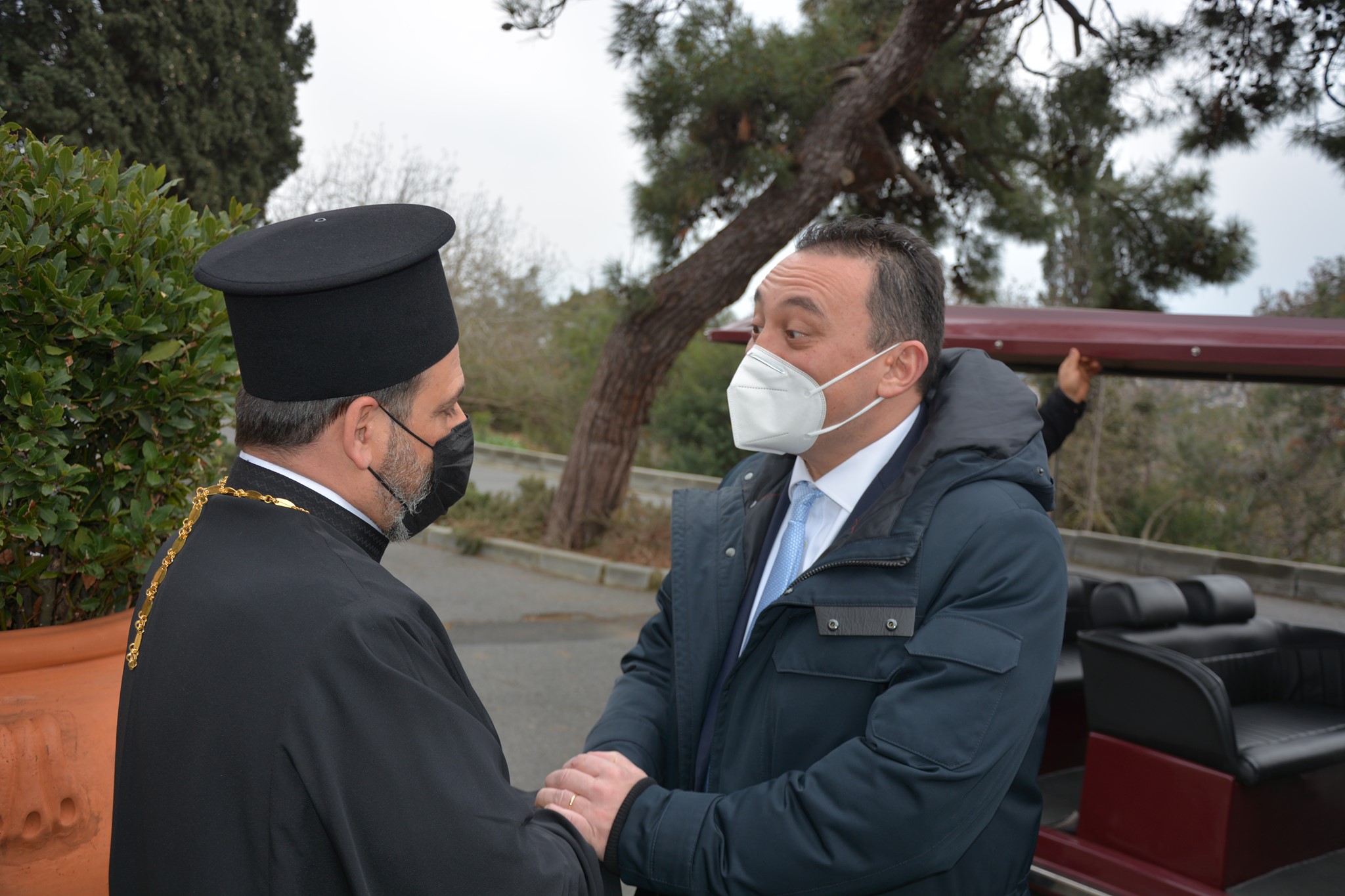 Επίσημη επίσκεψη πραγματοποίησε σήμερα, 19/03/2021, στη Θεολογική Σχολή ο Έλληνας Υφυπουργός Εξωτερικών Αρμόδιος για τον Απόδημο Ελληνισμό, Κωνσταντίνος Βλάσης, συνοδευόμενος από τον Έλληνα Πρέσβη στην Άγκυρα Έξοχ. κ. Μ. Διαμέση και την Γενική Πρόξενο της Πόλεως κ. Γ. Σουλτανοπούλου. Οι Έλληνες αξιωματούχοι έγιναν δεκτοί υπό του Καθηγουμένου, Θεοφιλεστάτου Επισκόπου Αραβισσού κ. Κασσιανού, και της περί αυτόν αδελφότητος, και προσκύνησαν στο ναΰδριο της Σχολής. Στη συνέχεια, ξεναγήθηκαν στην Αίθουσα Τελετών της Σχολής, όπου ο Ηγουμένος τους ενημέρωσε για την πλούσια ιστορία της, αλλά και για τα ζητήματα της ανακαίνισης και επαναλειτουργίας της. Αφού επισκέφθηκαν την ιστορική βιβλιοθήκη της Σχολής, οι υψηλοί επισκέπτες παρακάθησαν στην προς τιμήν τους παρατεθείσα τράπεζα.