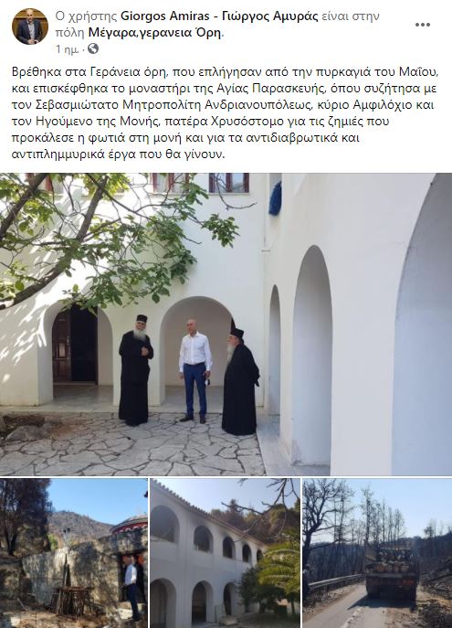Επίσκεψη στην πληγείσα από την πυρκαγιά του Μαΐου στα Γεράνεια Όρη, Ιερά Μονή Αγίας Παρασκευής στο Μάζι Μεγάρων, πραγματοποίησε ο Υφυπουργός Περιβάλλοντος και Ενέργειας Γιώργος Αμυράς την Τετάρτη 14 Ιουλίου 2021.