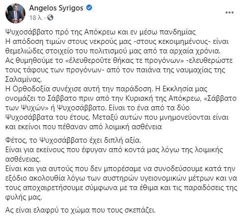 Με τίτλο στο σχόλιο του “Ψυχοσάββατο προ της Απόκρεω και εν μέσω πανδημίας” ο κ. Συρίγος αναφέρει πως η απόδοση τιμών στους νεκρούς μας -στους κεκοιμημένους- είναι θεμελιώδες στοιχείο του πολιτισμού μας από τα αρχαία χρόνια. Ας θυμηθούμε το «ἐλευθεροῦτε θήκας τε προγόνων» -ελευθερώστε τους τάφους των προγόνων- από τον παιάνα της ναυμαχίας της Σαλαμίνας”.