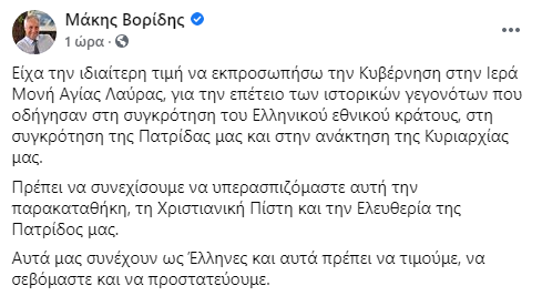“Είχα την ιδιαίτερη τιμή να εκπροσωπήσω την Κυβέρνηση στην Ιερά Μονή Αγίας Λαύρας, για την επέτειο των ιστορικών γεγονότων που οδήγησαν στη συγκρότηση του Ελληνικού εθνικού κράτους, στη συγκρότηση της Πατρίδας μας και στην ανάκτηση της Κυριαρχίας μας” αναφέρει ο Υπουργός Εσωτερικών κ. Μάκης Βορίδης σε επίκαιρη ανάρτησή του. “Πρέπει να συνεχίσουμε να υπερασπιζόμαστε αυτή την παρακαταθήκη, τη Χριστιανική Πίστη και την Ελευθερία της Πατρίδος μας. Αυτά μας συνέχουν ως Έλληνες και αυτά πρέπει να τιμούμε, να σεβόμαστε και να προστατεύουμε”.