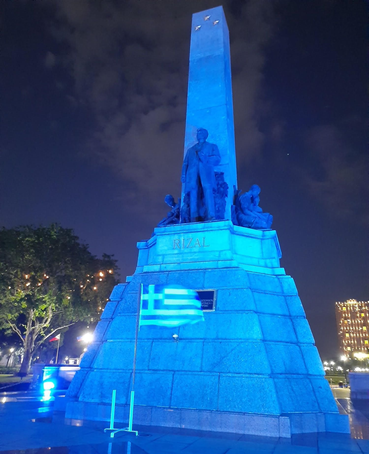 Στη Μανίλα, το εμβληματικό μνημείο αφιερωμένο στον εθνικό ήρωα των Φιλιππίνων Jose Rizal φωτίζεται στα ελληνικά χρώματα προς τιμήν της επετείου των 200 ετών από τον Αγώνα της ανεξαρτησίας
