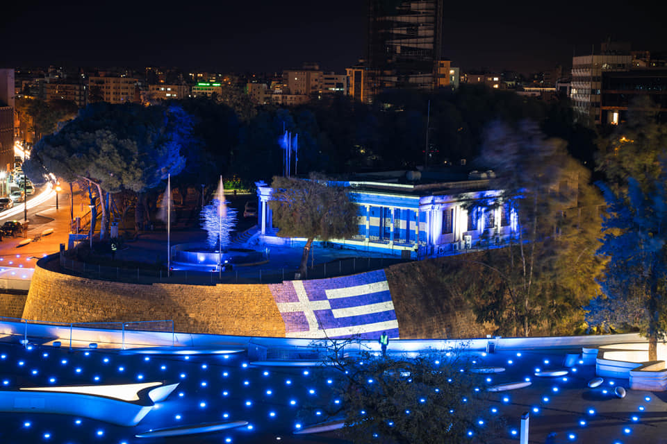 Η Λευκωσία φωτισμένη στα γαλανόλευκα για την ιστορική επέτειο των 200 ετών από την Επανάσταση του 1821.