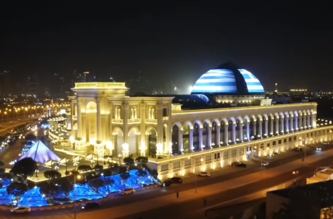 Η ελληνική σημαία προβάλλεται στον περιστρεφόμενο θόλο του Al Hazm Mall στη Ντόχα του Κατάρ για το σημερινό εορτασμό της επετείου των 200 ετών από την έναρξη της Επανάστασης του 1821