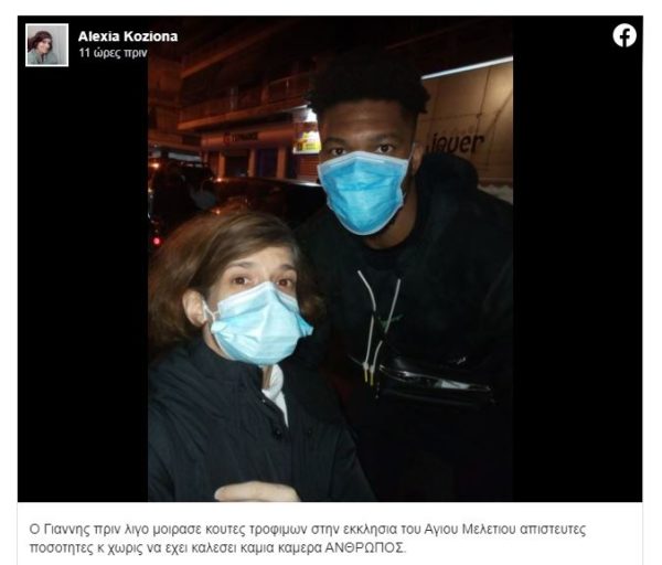 Μακριά από τις κάμερες και τα φώτα της δημοσιότητας, ο Πρωταθλητής του NBA με τους Μιλγουόκι Μπάκς, Γιάννης Αντετοκούμπο, είχε βρεθεί τον Νοέμβριο του 2020 στην παλιά του γειτονιά στα Σεπόλια. Ήταν μία συγκινητική βραδιά που μοίρασε κούτες με τρόφιμα σε ανθρώπους που έχουν ανάγκη, έξω από την εκκλησία του Αγίου Μελετίου. Την «αποκάλυψη» είχε κάνει μέσω του Facebook η νηπιαγωγός Αλεξία Κοζιονά, ανεβάζοντας μια φωτογραφία μαζί του και γράφοντας: «Ο Γιάννης πριν λίγο μοίρασε κούτες τροφίμων στην εκκλησία του Αγίου Μελετίου. Απίστευτες ποσότητες και χωρίς να καλέσει καμία κάμερα. ΑΝΘΡΩΠΟΣ».