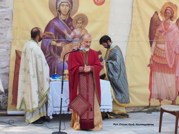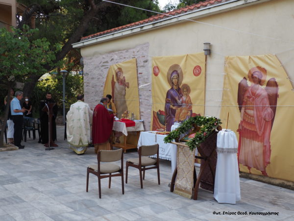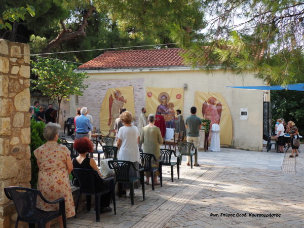 Στον προαύλιο χώρο το Ιερού Παρεκκλησίου κάτω από τα δέντρα, και με τους ήχους των τζιτζικιών, τελέστηκαν οι Ιερές Ακολουθίες.