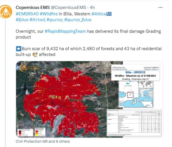 Συγκεκριμένα, όπως έδειξε ο δορυφόρος με βάση το ευρωπαϊκό σύστημα Copernicusς, που ενεργοποίησε σχεδόν από την αρχή της πυρκαγιάς η Πολιτική Προστασία, χτες, Σάββατο 21-8-2021 και τοπική ώρα 11.38, ο δορυφόρος κατέγραψε ακριβώς 94.324 στρέμματα (9.424,4 εκτάρια).