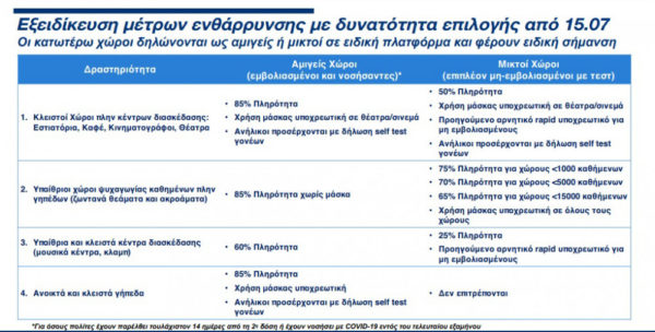 Για τα υπαίθρια και κλειστά κέντρα διασκέδασης (μουσικά κέντρα, κλαμπ), οι χώροι που θα δηλωθούν ως αμιγείς θα λειτουργούν με μέγιστη κάλυψη του 60% της χωρητικότητάς τους – χωρίς χρήση μάσκας και οι χώροι που θα δηλωθούν ως μεικτοί θα λειτουργούν με μέγιστη κάλυψη του 25% της χωρητικότητάς τους και η πρόσβαση του κοινού θα γίνεται με αρνητικό αποτέλεσμα rapid test τις τελευταίες 48 ώρες.