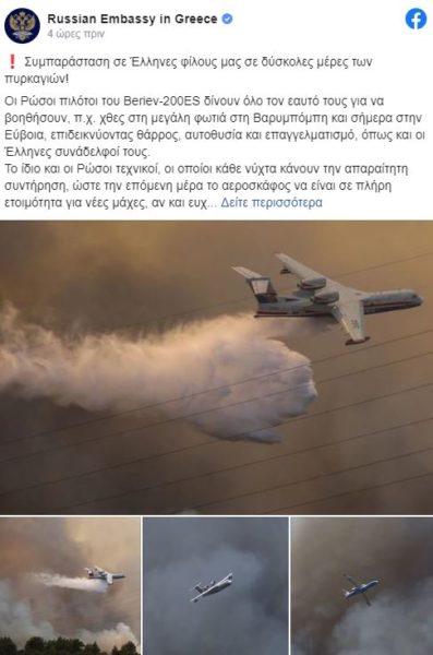 Στην ανάρτησή της, σημειώνει πως «οι Ρώσοι πιλότοι του Beriev-200ES δίνουν όλο τον εαυτό τους για να βοηθήσουν, π.χ. χθες στη μεγάλη φωτιά στη Βαρυμπόμπη και σήμερα στην Εύβοια, επιδεικνύοντας θάρρος, αυτοθυσία και επαγγελματισμό, όπως και οι Έλληνες συνάδελφοί τους».