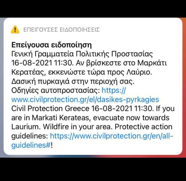 Το 112 έχει στείλει μήνυμα εκκένωσης στους κατοίκους στο Μαρκάτι, να εκκενώσουν προς στο Λαύριο.