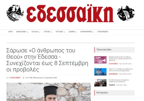“Σάρωσε «Ο άνθρωπος του Θεού» στην Έδεσσα. Συνεχίζονται έως 8 Σεπτέμβρη οι προβολές” όπως χαρακτηριστικά αναφέρει το ηλεκτρονικό, τοπικό μέσο ενημέρωσης “ΕΔΕΣΣΑΪΚΗ” (edessaiki.gr) σε δημοσίευμα της 1ης Σεπτεμβρίου.