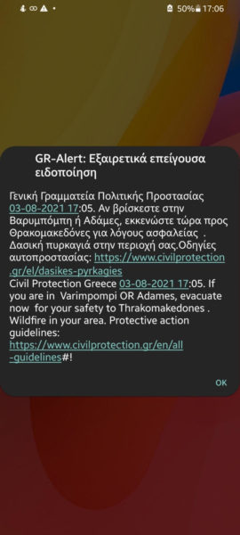 Το μήνυμα, που έστειλε πρώτα η Πολιτική Προστασία, ανέφερε χαρακτηριστικά: