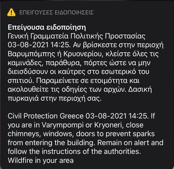 «Επείγουσα ειδοποίηση Γενική Γραμματεία Πολιτικής Προστασίας 03-08-2021, 14.25. Αν βρίσκεστε στην περιοχή Βαρυμπόμπης ή Κρυονερίου, κλείστε όλες τις καμινάδες, παράθυρα, πόρτες ώστε να μην διεισδύσουν οι καύτρες στο εσωτερικό του σπιτιού. Παραμείνετε σε ετοιμότητα και ακολουθείστε τις οδηγίες των αρχών. Δασική πυρκαγιά στην περιοχή σας».