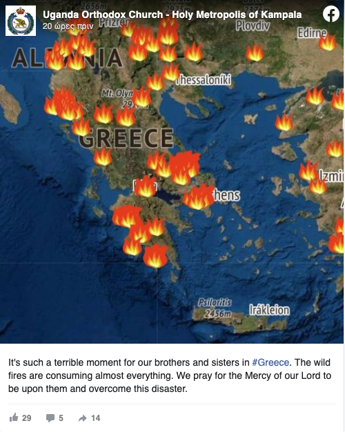 Μήνυμα συμπαράστασης από την Ουγκάντα στέλνει στην Ελλάδα η Ιερά Μητρόπολη Καμπάλας του Πατριαρχείου Αλεξανδρείας, μέσω ανάρτησης σε μέσο κοινωνικής δικτύωσης αναφορικά με τις πυρκαγιές που πλήττουν την χώρα.