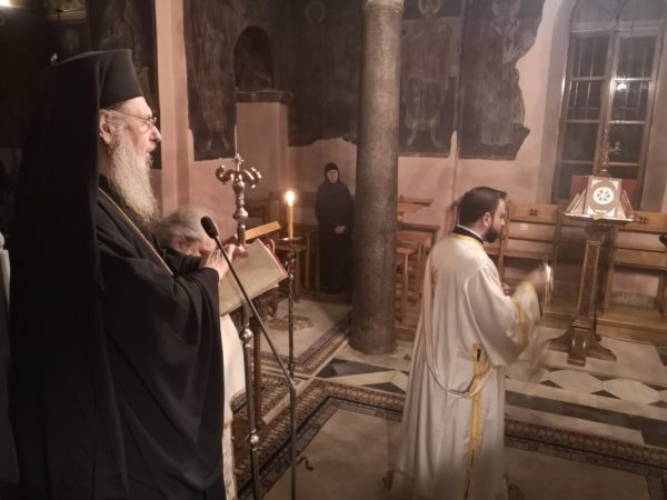 Έτσι φέτος, με Συνοδική Απόφαση,  ο Εσπερινός τελέστηκε στο Συνοδικό Παρεκκλήσιο (Καθολικό της Ιεράς Μονής Ασωμάτων Πετράκη), χοροστατούντος του Καθηγουμένου της Ιεράς Μονής, Θεοφιλεστάτου Επισκόπου Θαυμακού κ. Ιακώβου.