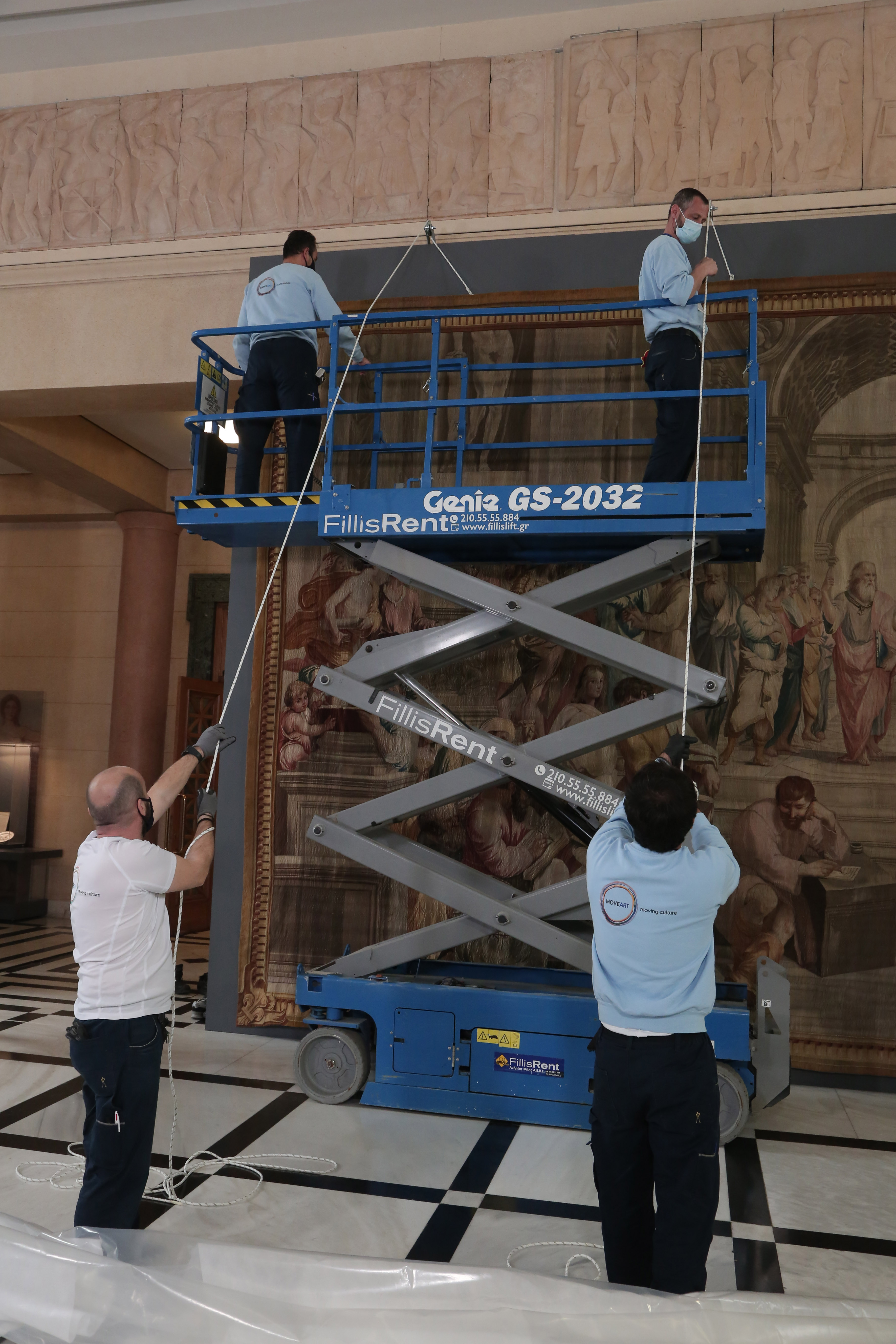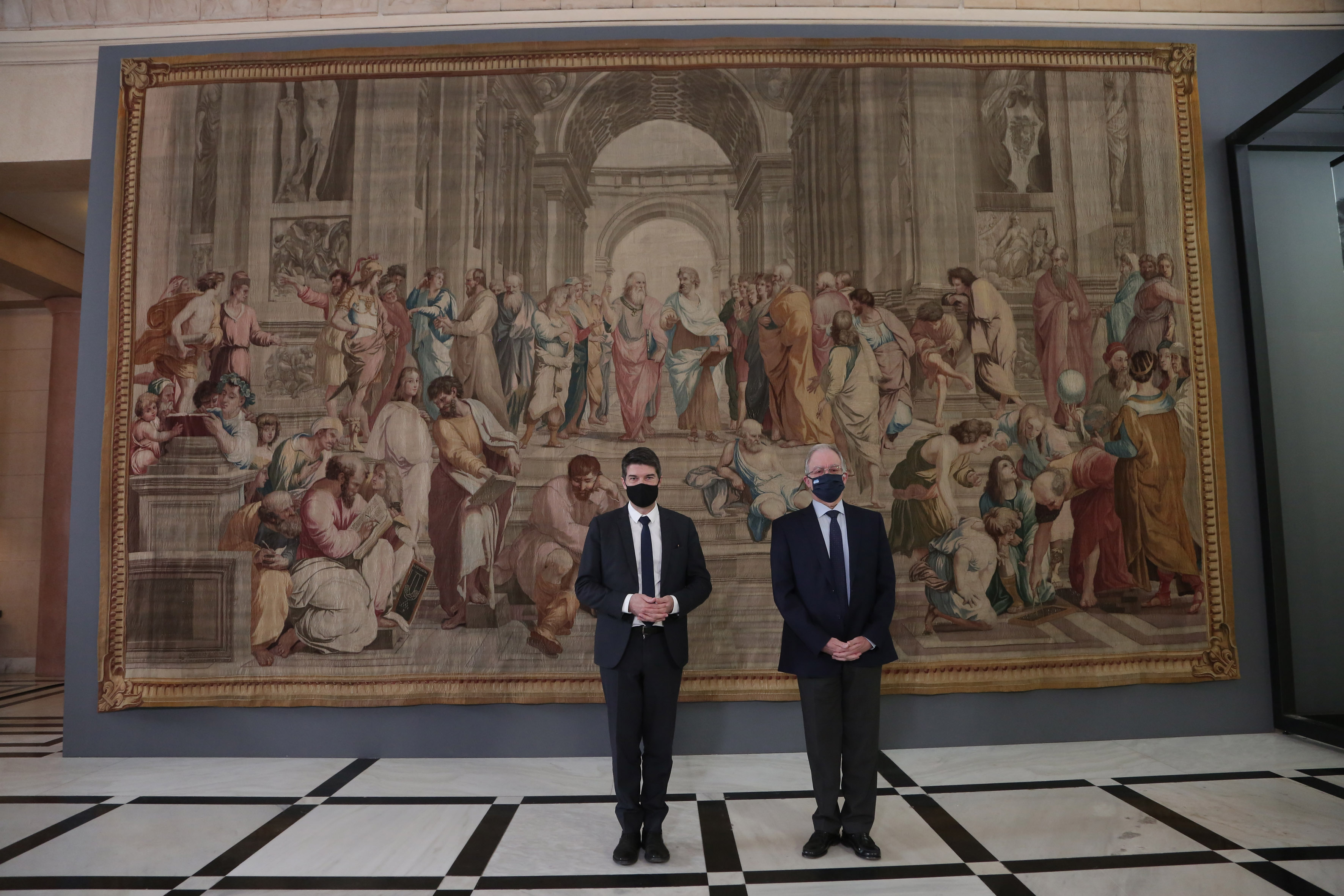 Όπως σημείωσε ο Πρόεδρος της Βουλής, είναι η πρώτη φορά από τότε που κατασκευάστηκε, το 1775, από το περίφημο εργοστάσιο Γκομπλέν στο Παρίσι, που ο συγκεκριμένος τοιχοτάπητας φεύγει από τη Γαλλία, αλλά «επιστρέφει στην Αθήνα, στην πόλη τη Σχολή της οποίας με τόση καλλιτεχνική έμφαση αποδίδει».