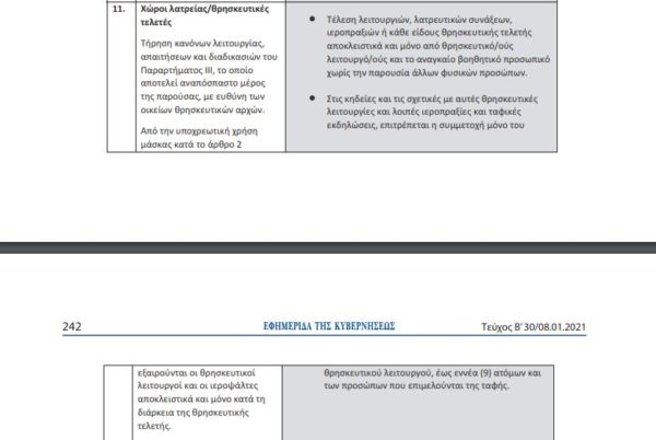 Για την προσέλευση φυσικών προσώπων για κατ’ ιδίαν προσευχή και βραχεία παραμονή στον χώρο λατρείας, σύμφωνα με την ΚΥΑ, “επιτρέπεται στο πλαίσιο των προβλεπόμενων λόγων μετακίνησης κατά τις διατάξεις της παρούσας και υπό την προϋπόθεση ότι ο μέγιστος αριθμός ατόμων που επιτρέπεται να παρίσταται ταυτοχρόνως εντός του χώρου λατρείας προκύπτει από την τήρηση της αναλογίας ενός ατόμου ανά δεκαπέντε (15) τ.μ. επιφάνειας, με ελάχιστη απόσταση δύο (2) μέτρων μεταξύ τους προς όλες τις κατευθύνσεις και σε κάθε περίπτωση δεν υπερβαίνει τα είκοσι πέντε (25), τηρουμένων πάντως των προληπτικών μέτρων υγιεινής για την αποφυγή μετάδοσης του κορωνοϊού COVID-19. Εφόσον έχει πραγματοποιηθεί η τέλεση λειτουργίας λατρευτικής σύναξης, ιεροπραξίας και κάθε είδους θρησκευτικής τελετής, πρέπει να παρέλθει υποχρεωτικά χρονικό διάστημα τουλάχιστον μίας (1) ώρας πριν επιτραπεί η ατομική προσευχή στον εν λόγω χώρο λατρείας. Κατά το διάστημα αυτό πρέπει να διενεργείται φυσικός αερισμός του χώρου λατρείας”.