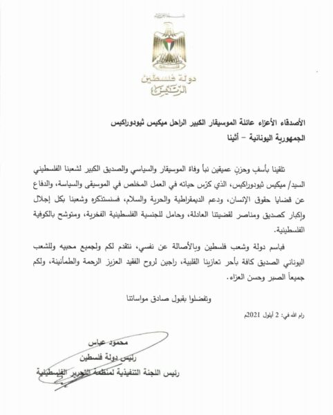Λάβαμε με βαθιά λύπη και θλίψη την είδηση του θανάτου του μουσικού, πολιτικού και μεγάλου φίλου του παλαιστινιακού μας λαού, κ. Μίκη Θεοδωράκη, ο οποίος αφιέρωσε τη ζωή του στη μουσική, την πολιτική, την υπεράσπιση των ανθρωπίνων δικαιωμάτων και στην υποστήριξη της δημοκρατίας, της ελευθερίας και της ειρήνης.