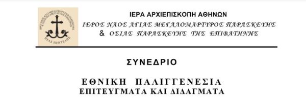 ΣΥΝΕΔΡΙΟ υπό την αιγίδα της Ιεράς Αριχεπισκοπής Αθηνών πραγματοποιείται στον Ιερό Ναό Αγίας Μεγαλομάρτυρος Παρασκευής και Οσίας Παρασκευής της Επιβατηνής , το Σάββατο και Κυριακή, 30-31 Μαϊου, υπό το θέμα “ΕΘΝΙΚΗ ΠΑΛΙΓΓΕΝΕΣΙΑ – ΕΠΙΤΕΥΓΜΑΤΑ ΚΑΙ ΔΙΔΑΓΜΑΤΑ”.