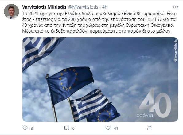 Ανάρτηση στον προσωπικό του λογαριασμό στο twitter έκανε ο αναπληρωτής υπουργός Εξωτερικών Μιλτιάδης Βαρβιτσιώτης με αφορμή τη συμπλήρωση 40 ετών από την ένταξη της χώρας μας στην ευρωπαϊκή οικογένεια, την τότε ΕΟΚ και τα 200 χρόνια από την Επανάσταση του 1821 σημειώνοντας: «Το 2021 έχει για την Ελλάδα διπλό συμβολισμό: εθνικό και ευρωπαϊκό. Είναι έτος-επέτειος για τα 200 χρόνια από την Επανάσταση του 1821 και για τα 40 χρόνια από την ένταξη της χώρας στη μεγάλη ευρωπαϊκή οικογένεια. Μέσα από το ένδοξο παρελθόν, πορευόμαστε στο παρόν και στο μέλλον».