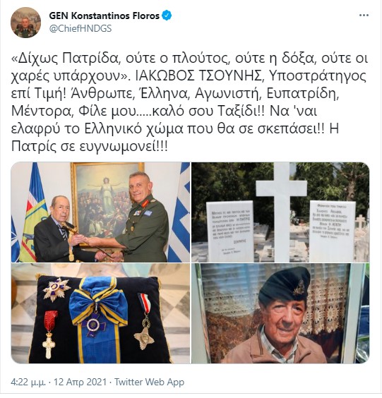 “Δίχως Πατρίδα, ούτε ο πλούτος, ούτε η δόξα, ούτε οι χαρές υπάρχουν». ΙΑΚΩΒΟΣ ΤΣΟΥΝΗΣ, Υποστράτηγος επί Τιμή! Άνθρωπε, Έλληνα, Αγωνιστή, Ευπατρίδη, Μέντορα, Φίλε μου…..καλό σου Ταξίδι!! Να ‘ναι ελαφρύ το Ελληνικό χώμα που θα σε σκεπάσει!! Η Πατρίς σε ευγνωμονεί!!!” έγραψε χαρακτηριστικά ο Στρατηγός σε Μέσο Κοινωνικής Δικτύωσης.