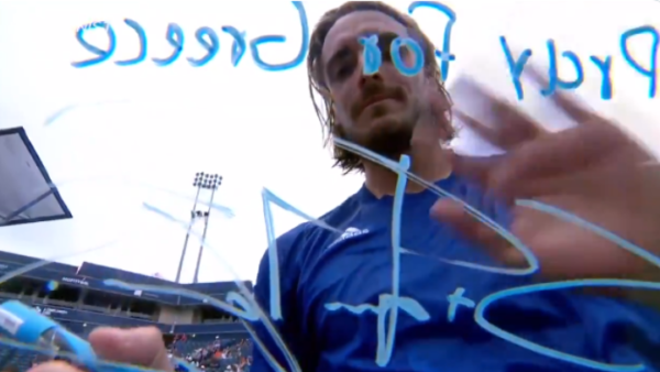 Στην καθιερωμένη υπογραφή του νικητή με μαρκαδόρο στην κάμερα της παραγωγής που καλύπτουν τους αγώνες τένις του Τορόντο, ο Έλληνας πρωταθλητής έγραψε “Pray for Greece” («προσευχόμαστε για την Ελλάδα»), δείχνοντας τη στήριξή του για τις δύσκολες στιγμές που περνάει η χώρα μας.