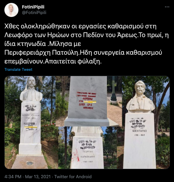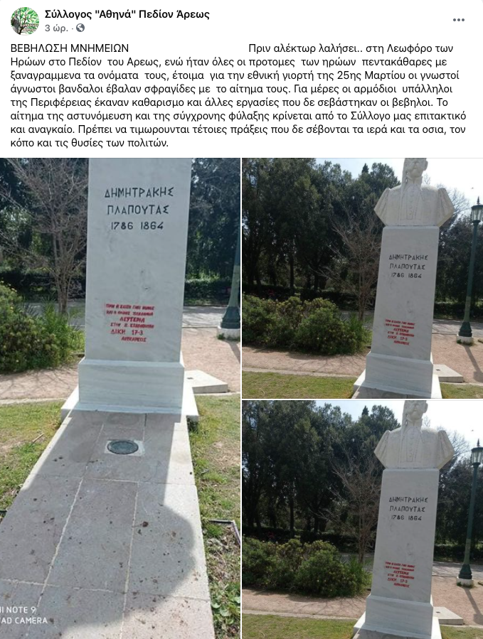 Τους νέους βανδαλισμούς καταγγέλουν η βουλευτής της Νέας Δημοκρατίας Φωτεινή Πιπιλή καθώς και ο Σύλλογος “Αθηνά – Πεδίον Άρεως” μέσω σημερινών αναρτήσεων τους (13/3) σε μέσα κοινωνικής δικτύωσης.