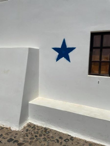 “Πρωτοφανής βεβήλωση και βανδαλισμός του Ιερού παρεκκλησιού του Αγίου Μάρκου στο Ημεροβίγλι. Γέμισαν περιμετρικά τον ναό με αστέρια. Έχουν γίνει όλες οι διαδικασίες για την αποκατάσταση της ζημιάς.”, αναφέρεται χαρακτηριστικά και παράλληλα παρατίθενται οι σχετικές φωτογραφίες.