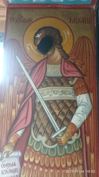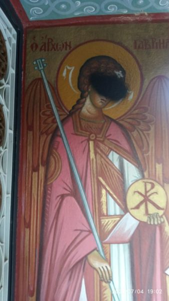 Σύμφωνα με πληροφορίες του ope.gr, το Ψυχοσάββατο προ της Πεντηκοστής (19/6/2021), μεταξύ 6:00 και 6:30 το πρωί, άγνωστος με κράνος και μαύρα ρούχα εισέβαλε στο χώρο του ναού να συλήσει τις ιερές εικόνες. Ο δράστης καταγράφηκε από κλειστό κύκλωμα ασφαλείας να βάφει με σπρέι, όπως θα δείτε και στις φωτογραφίες που δημοσιεύουμε, τα πρόσωπα στις αγιογραφίες. Ένα σπρέι, που πολύ δύσκολα φεύγει, με αποτέλεσμα να προκληθεί τεράστια ζημιά στις μορφές του Χριστού, της Παναγίας, των Αρχαγγέλων και του Αγίου Τρύφωνος…