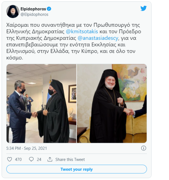 От своя страна, Архиепископ Елпидофор написа в Twitter следното: