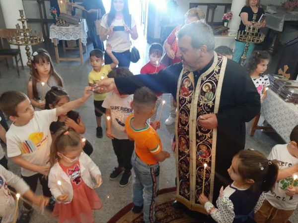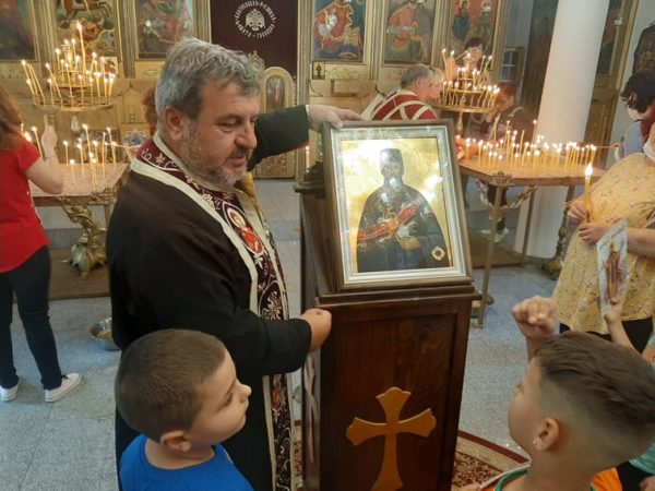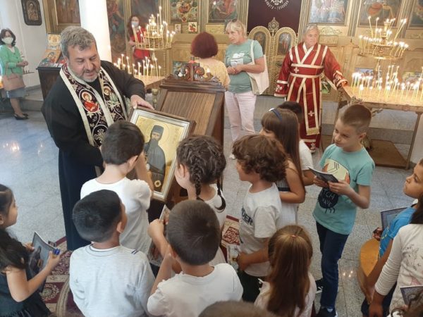 Групата на госпожа Кина Димова, получи ценни съвети от предстоятеля на църквата отец Николай Клюнков за паленето на църковната свещ, молитвата, както и за кръстния знак и прекръстването. Свещеникът, заедно с автора на книгите и филма за св. Ефрем, Ангел Бончев, разказаха на малчуганите житието на св. Ефрем Нови, след което децата едно по едно се поклониха и целунаха светия образ на Ефрем и получиха като подарък от Ангел Бончев детската книга за св. Ефрем Нови „Светецът светкавица“. Любопитни да научат за живота на светията, децата задаваха различни въпроси, на които получиха отговор за вярата, добротата, любовта към ближния и за Православието.