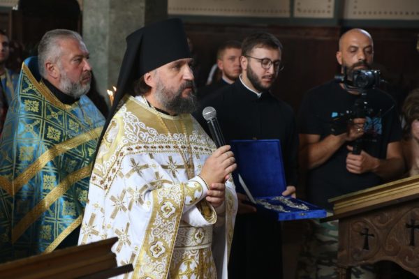 Митрополита Киприана также поздравил представитель Патриарха Московского и всея Руси архимандрит Вассиан и вручил ему памятный подарок – крест и панагию.