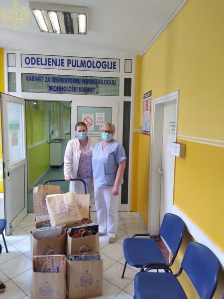 У циљу спровођења мера заштите због вируса корона, пакетиће су испред Ургентног пријема са радошћу примили доц. др Јелена Антић, директор Института, професор др Слободан Спасојевић, заменик управника Клинике за педијатрију, др Андреја Ђуретић, пи-ар Института, Бориславка Драгишић, главна сестра Института, Биљана Миловановић Угрица, главна сестра Клинике за педијатрију, и Јасмина Цветковић, главни санитарни техничар Института.
