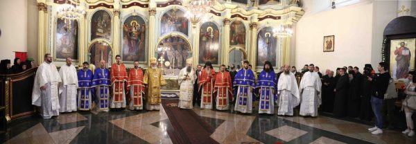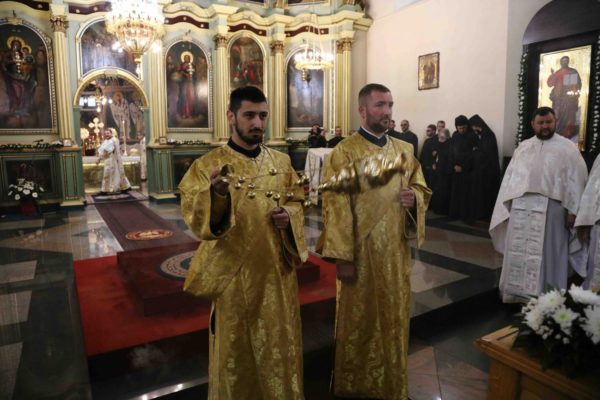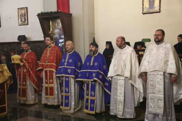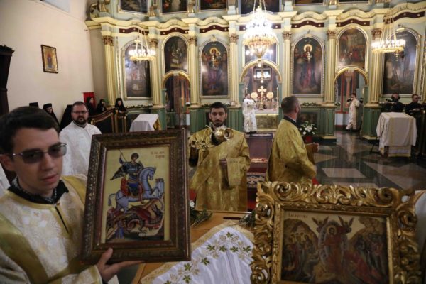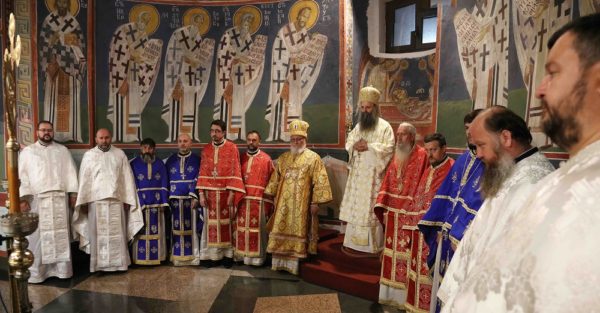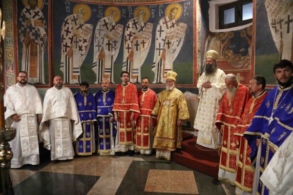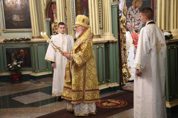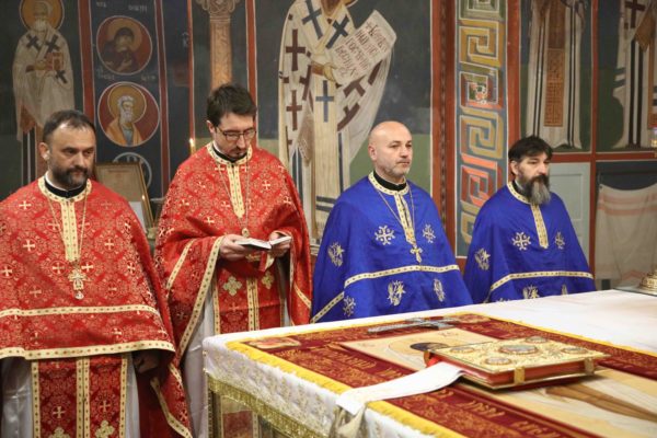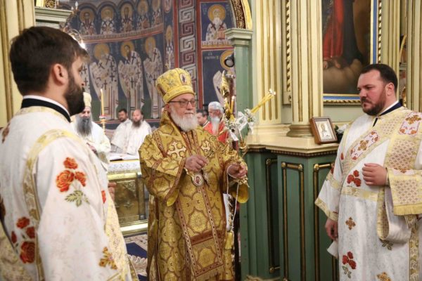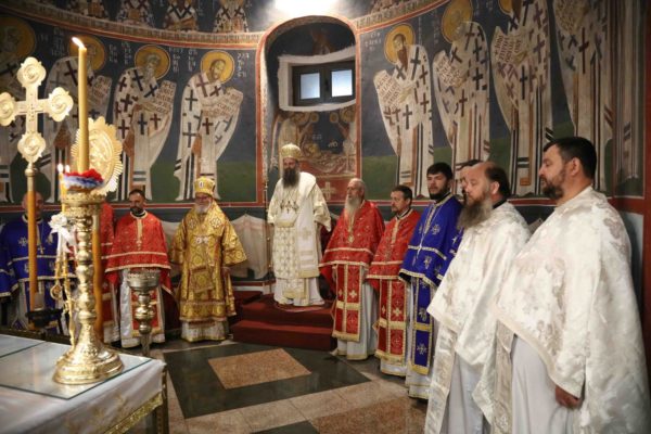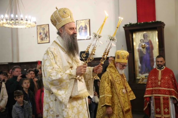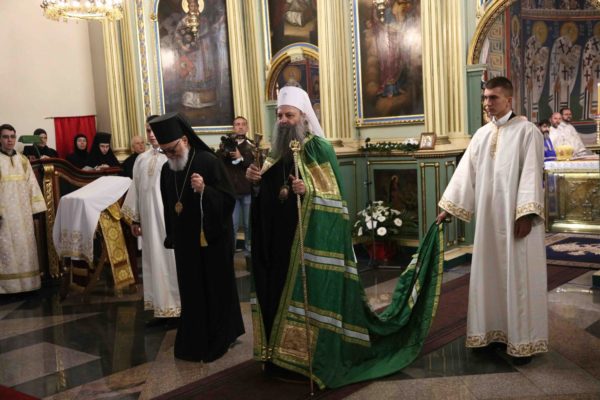 На крају свете Литургије владика Никанор је поздравио Његову Светост и даровао му икону Светог Теодора Вршачког. Патријарх Порфирије је захвалио епископу Никанору и у беседи поручио: – Треба да градимо јединство и да у вери у Христа будемо једно. Вера у Васкрсење Христово, у победу над смрћу, над неправдом, и у нашу победу над пролазношћу, обликовала је наш народ од најранијих времена. Таквом вером су живели православни Срби. То показује да је наш народ црпео смисао свог постојања и снагу у прослављању Бога, радовао се ономе што јесте у истој тој мери и када наиђу искушења на просторима на којима живи и знао да није сам, да је Бог са њим и Крст Христов са њим.
