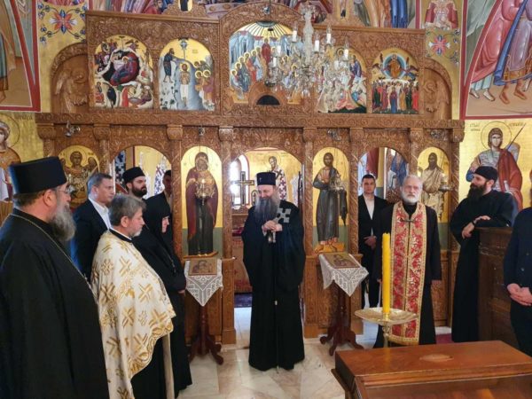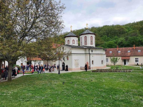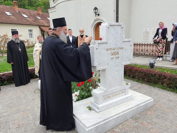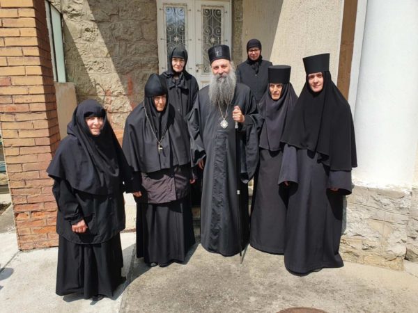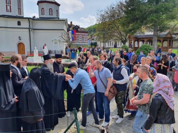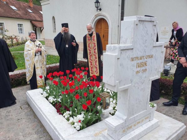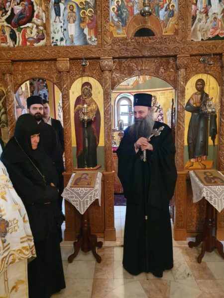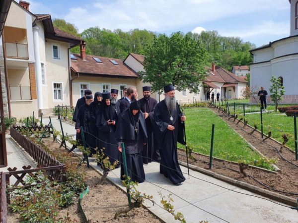 Његову Светост Патријарха дочекала је високопреподобна игуманија Евгенија са сестринством. Патријарх се помолио светињама у манастирским храмовима Светог архангела Михаила, Светог Николе Мирликијског и Успења Пресвете Богородице, а затим на гробовима својих претходника патријараха Димитрија и Павла отпевао васкршњи тропар.