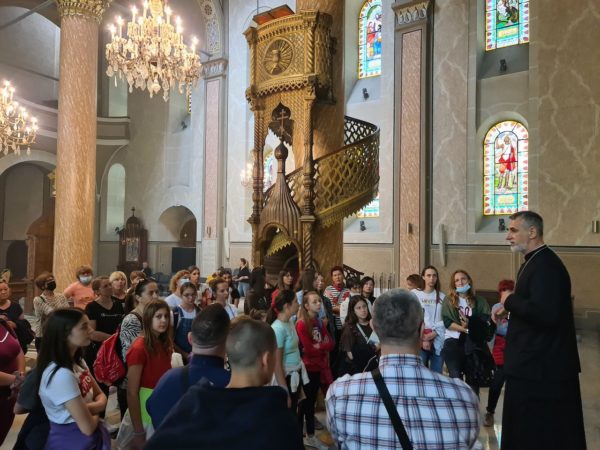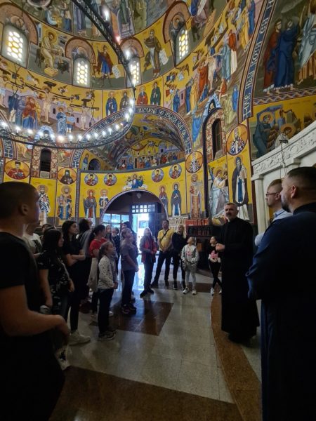 Послије уживања у природом амбијенту путовање смо наставили ка Преображењској цркви гдје нас је домаћински дочекао свештеник Чедомир Ђелмо и упознао нас са основним подацима о овој прелијепој цркви која је својом љепотом спољашње и унутршње архитектуре плијенила наше погледе и утиске гдје смо се радо задржали тренутак више и забиљежили лијепе тренутке, након чега је отац Чедомир позвао наше полазнике вјеронауке на послужење и освјежење у порти храма. За то вријеме отац Чедомир је оцу Драгославу показао нову и веома вриједну библиотеку која се налази у оквиру самог храма.