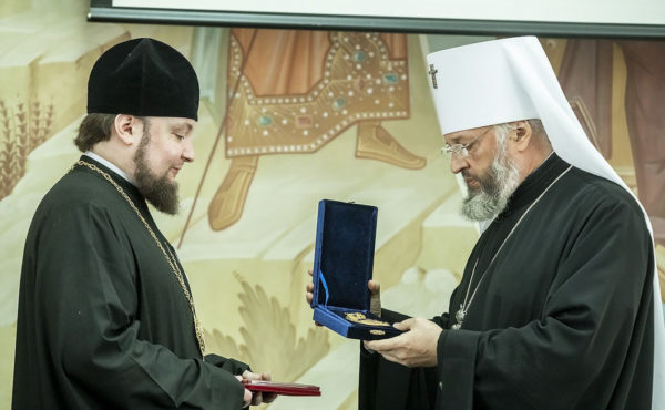 Елена Алексеевна Пахомова от лица губернатора Кемеровской области – Кузбасса вручила медаль «За веру и добро» заместителю председателю председателя Синодального отдела по делам молодежи иерею Алексию Соловьеву.