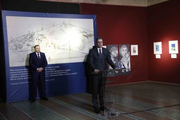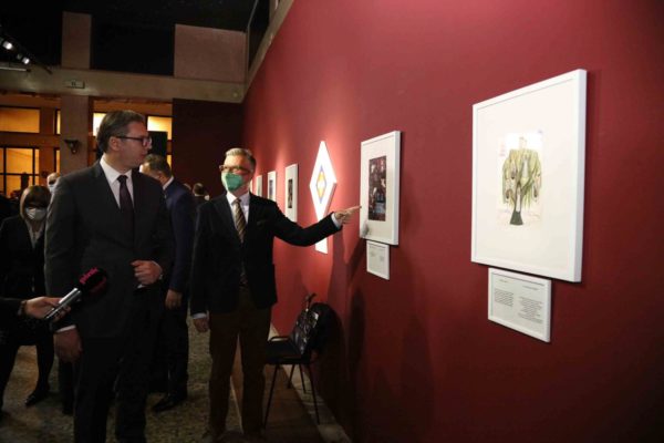 „Нема никаквог разлога да ћутимо о највесћем греху почињеном над нама, греху сувишности и истребљења. Сећање на тај злочин на њега није никакав позив на мржњу, већ као опомена показује да је једини пут којим треба да се иде пут живота, а Србија је данас управо на том путу разума и праштања. Управо због тога, али и дивних цртежа на овој изложби, нећу да одговарам бесмисленим и увређивим наводима хрватских званичника, данас, на тужни дан сећања на велику трагедију српског народа. Праштање није могуће ако заборавимо шта треба да опростимо. Дан сећања на највећи злочин је важан због оне будућности у којој сувишних неће бити, у којој ће се деца радовати сутрашњици, неће морати да преживљавају све што су на својим цртежима написали и нацртали”, додао је председник Вучић.