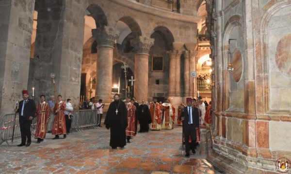 Саслуживали су Митрополит капитолијски Исихије и Архиепископи гераски Теофан, константински Аристарх и севастијски Теодосије, заједно са светогробним јеромонасима, архимандритом Нектаријем и ђаконима. У наставку је служена вечерња служба са коленопреклоним молитвама.