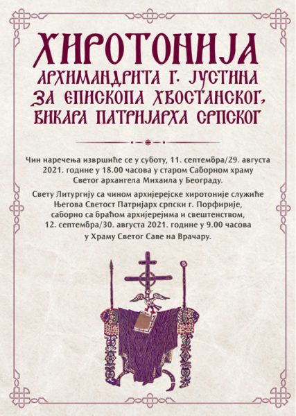Чин наречења изабраног Епископа хвостанског извршиће се у суботу, 11. септембра 2021. године, у старом Саборном храму Светог архангела Михаила у Београду, са почетком у 18 часова.
