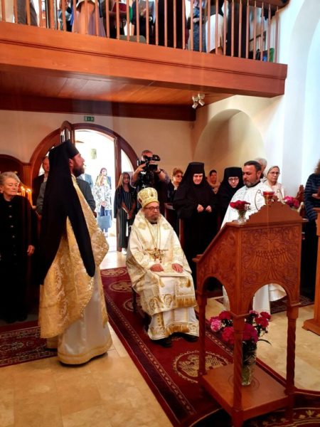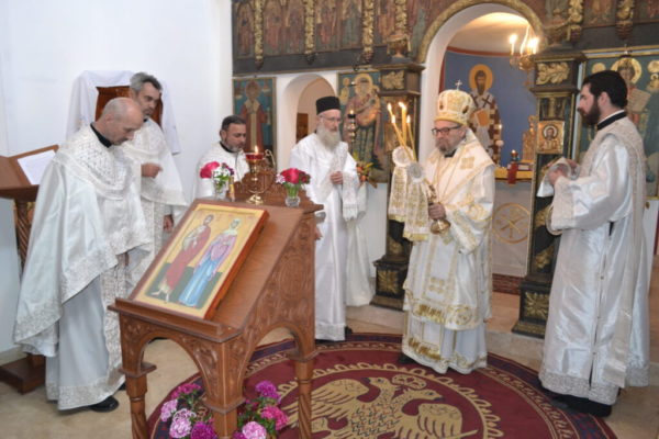 Преосвештеном Архијереју саслуживали су јеромонах Варнава Кнежевић, секретар, јереј Зоран Живић, архијерејски намесник мохачки, јеромонах Митрофан Гајић, духовник манастира Грабовца, протонамесник Јован Бибић, парох у Сантову, јереј Милан Ерић и протођакон Андраш Штријк из Печуја, као и ђакон Стефан Милисавић.