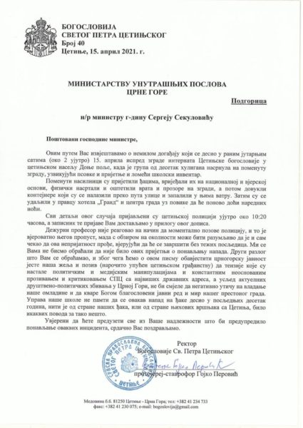 15/04/2021 15/04/2021 Ректор Богословије Светог Петра Цетињског протојереј-ставрофор Гојко Перовић данас се, поводом ноћашњег напада цетињских хулигана на интернат Богословије, обратио министру унутрашњих послова г. Сергеју Секуловићу. Писмо преносимо у цјелости: Поштовани господине министре, Овим путем Вас извјештавамо о немилом догађају који се десио у раним јутарњим сатима (око 2 ујутро) 15. априла испред зграде интерната Цетињске...