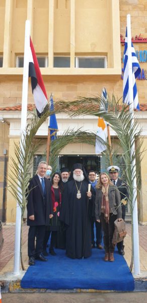 وبحضور القنصل العام لليونان في الإسكندرية السيدAthanasios Kotsionis، وقنصل لبنان السيد/ عبد العزيز عيسى. والكابتن Costas Varouxis ضابط الارتباط بين البحرية اليونانية والبحرية المصرية الموجود في الإسكندرية، الأمين العام للجالية اليونانية بالإسكندرية السيد/ ديميتريس كافوراس.