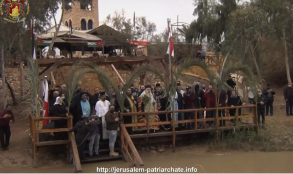 غبطة البطريرك بعد ذلك توجه الى ضفة نهر الاردن في المكان الذي اعتمد فيه السيد المسيح, وقام من على المنصة الرسمية بصلاة تقديس مياة نهر الأردن وبرمي الصليب المقدس في مياه النهر كما هي العاده, ورتل الآباء طروبارية عيد الظهور الالهي.