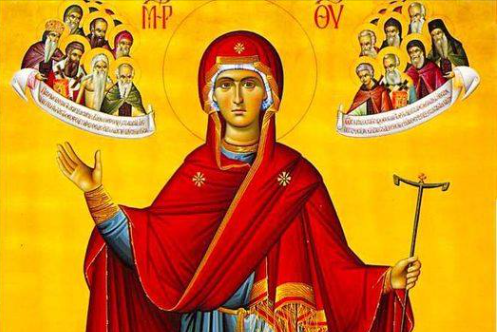 الأيقونة تُظهر والدة الإله تقف فوق الجبل وتلاله.