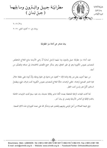 تفيد أمانة سرّ مطرانيّة جبيل والبترون وما يليهما (جبل لبنان) أنّ راعي الأبرشية يتابع العلاج المخصّص للمصابين بفيروس الكورونا وهو في طور التعافي، وهو يشكر جميع المتّصلين للاطمئنان إلى صحّته والمصلّين من أجله.