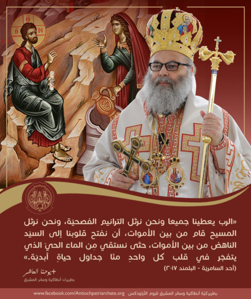 في انتصاف العيد اسقِ نفسي العطشى مِن مياه العبادة الحسنة أيها المخلّص. لأنّكَ هتفتَ نحو الكلّ قائلاً: من كان عطشانًا فليأتِ إليَّ ويشرب. فيا ينبوعَ الحياة، أيُّها المسيح إلهنا المجد لك.