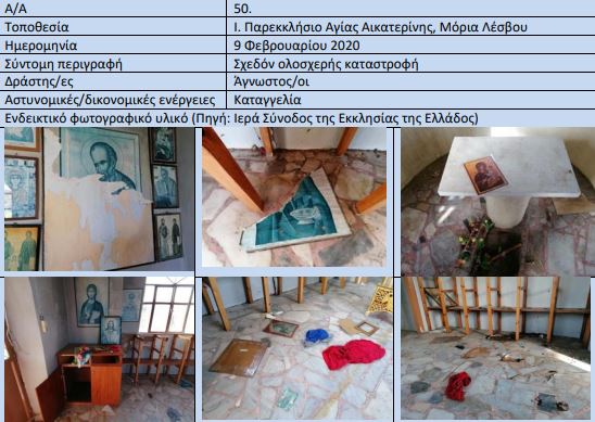 Большинство случаев касается православной Церкви, так как отмечено в общей сложности 374 случаев, то есть 92,57%, а в общей сложности по округам наибольшее количество происшествий отмечается в Центральной Македонии (63) и в Южном Эгейском море (о.Родос, 55) наименшее количество случаев отмечено в Западной Македонии (6) и на Святой Горе (1).